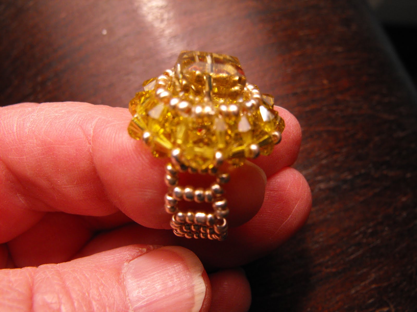 there as well. The ring is made of Swarvoski crystals and seed beads. The design was from a web site in Korea. The design called for different beads. I changed it up because I thought that it would be beautiful in